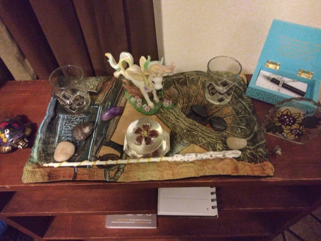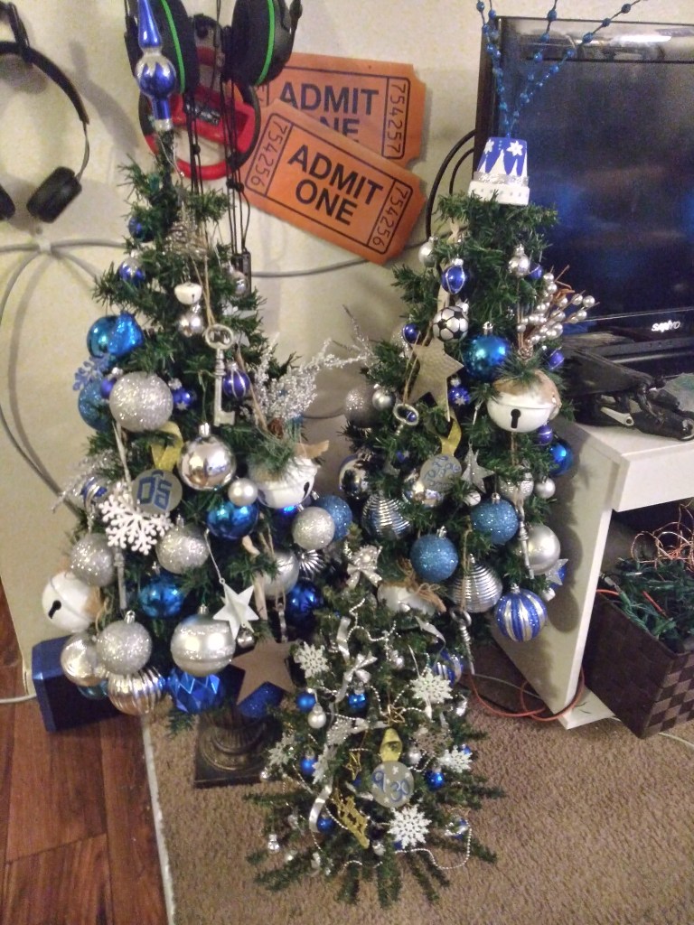 The cat passed away last year, and I was 9 other desks short of work space to decorate. The boys helped me put these three up and learned how to space ornaments. My winter wreath stays up on the door through the end of February and matches the trees. I’m thinking of leaving these up until at least end of January. Something pretty to enjoy while starting chemo.