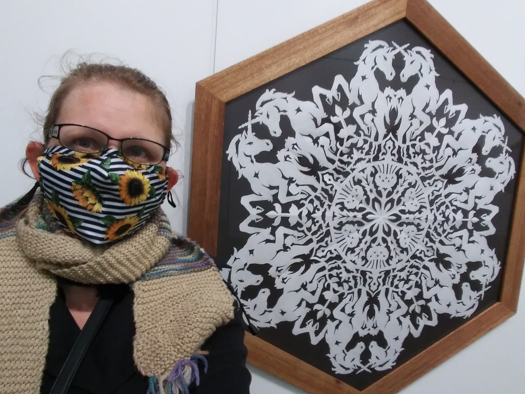 My local library dedicates their main entrance to artists. Lately they’ve been paper snowflakes someone takes to new levels and sells for $600 fully framed. Of course this one is my favorite. (Please don’t buy it for me. I’m running out of space to hang things.)